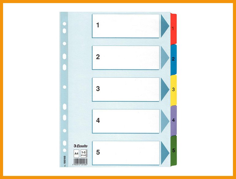 5-osaisessa Esselte Mylar -hakemistossa on värilliset, numeroin 1-5 painetut ja muovilla vahvistetut kielekkeet. 160 gsm kartongista valmistetussa hakemistossa on vahvistettu rei'itysliuska etusivulla ja yleisrei'itys.Koko: A4 (297 x 225 mm)