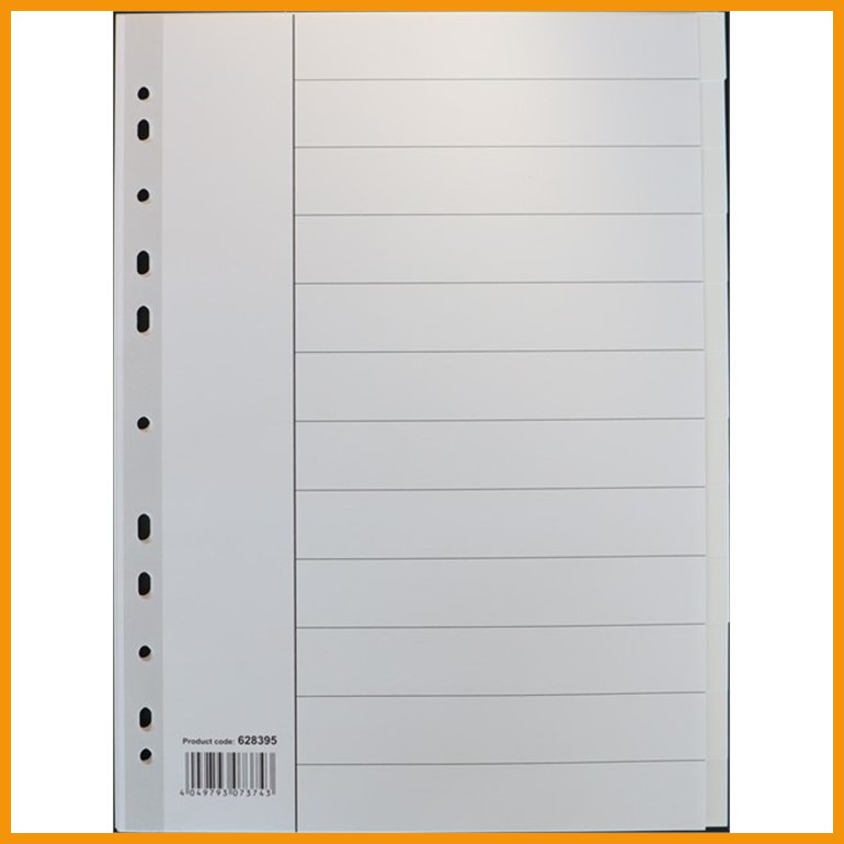 12-osaisessa välilehdessä on blankot välilehdet eikä erillisiä muovikääreitä. 130 gsm kartongista valmistetussa välilehdessä on yleisrei'itys.Koko: A4 (297 x 225 mm)