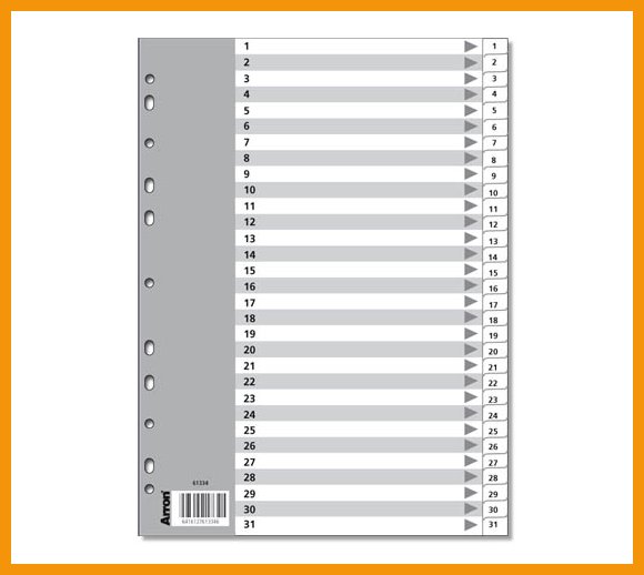 31-osaisessa numerohakemistossa on valkoiset kartonkiset (120 g) lehdet sekä numeroin 1-31 painettu etusivu ja kielekkeet. FSC-sertifioidusta kartongista valmistetussa hakemistossa on yleisrei'itys. Tuotteessa ei ole ylimääräisiä muovikääreitä.Koko: A4.