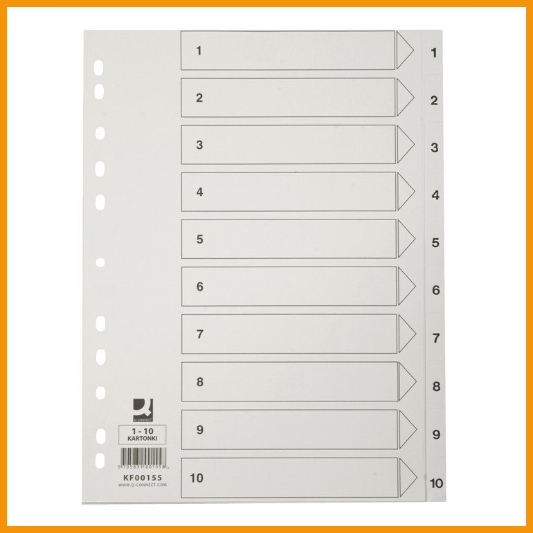 Q-CONNECTin 10-osaisessa välilehdessä on valkoiset kartonkiset (110 g) lehdet sekä numeroin 1-10 painettu etusivu ja kielekkeet. PEFC-sertifioidusta kartongista valmistetussa välilehdessä on yleisrei'itys.Koko: A4