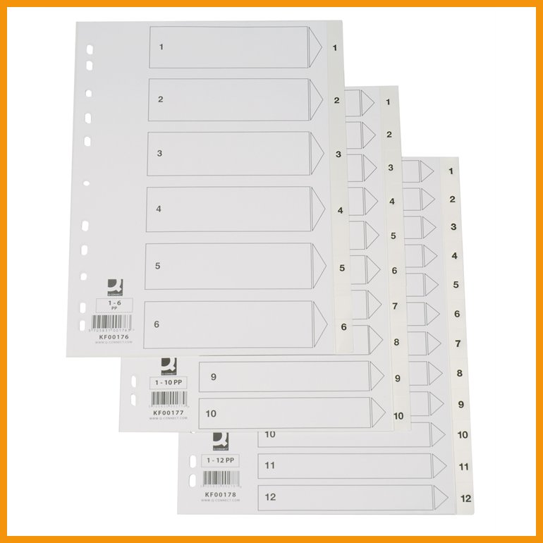 Q-CONNECTin 12-osaisessa välilehdessä on PP-muoviset lehdet (125 my) sekä numeroin 1-12 painettu etusivu ja muovikielekkeet. Etusivu on 120 gsm kartonkia. Välilehdessä on yleisrei'itys.Koko: A4
