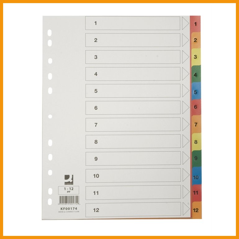 Q-CONNECTin 12-osaisessa välilehdessä on valkoinen, kartonkinen kansilehti ja värilliset PP-muovilehdet (125 my). Välilehti on numeroitu 1-12 ja siinä on yleisrei'itys.Koko: A4