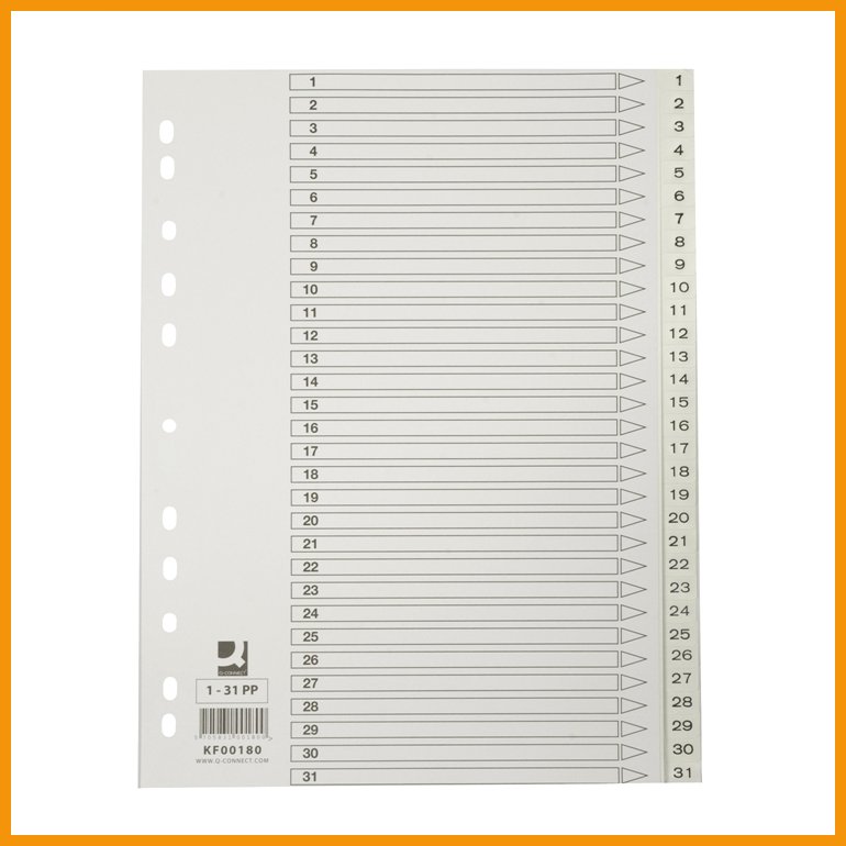Välilehti Q-CONNECT A4 1-31 PP valkoinen on erinomainen toimistotuote, jonka verkkokaupan tilauksen toimitus kestää 1-2 päivää. Tiedäthän, että ilmainen toimitus on kaikilla yli 140 € hintaisilla tilauksilla! Meiltä voit tilata laskulla ja ilman rekisteröitymistä.