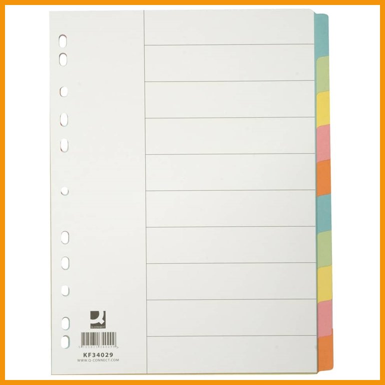 Q-CONNECTin 10-osaisessa välilehdessä on värilliset kartonkiset (175 g) lehdet ja valkoinen etusivu. Välilehdet ovat blankot. PEFC-sertifioidusta kartongista valmistetussa välilehdessä on yleisrei'itys.Koko: A4
