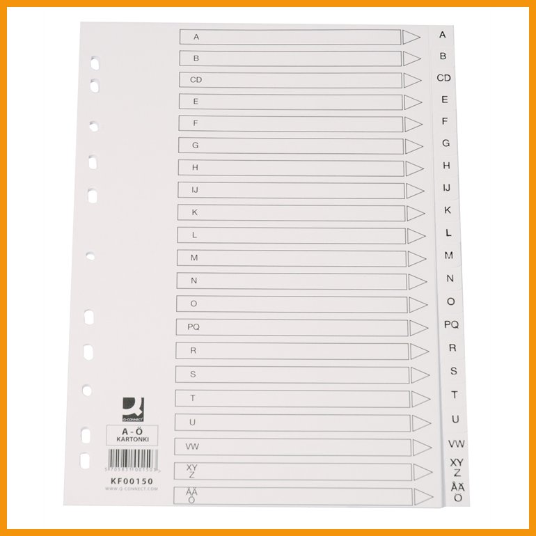 Q-CONNECTin aakkostetussa välilehdessä on PP-muovilehdet (120 my) lehdet sekä kirjaimin A-Ö painettu etusivu ja kielekkeet. Välilehdessä on yleisrei'itys.Koko: A5