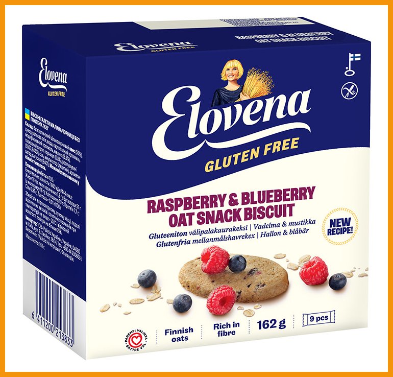 Elovenan Vadelma-Mustikka -välipalakeksi on gluteeniton vaihtoehto herkkusuille. Runsaasti kuitua sisältävä, 100 % suomalaisesta täysjyväkaurasta valmistettu keksi on yksittäispakattuna näppärä napata mukaan päivän rientoihin antamaan paljon kaivattua lisäpotkua. Tuotteelle on myönnetty Suomen Sydänliiton Sydänmerkki ja Avainlippu.Pakkauksessa on 9 keksiä.