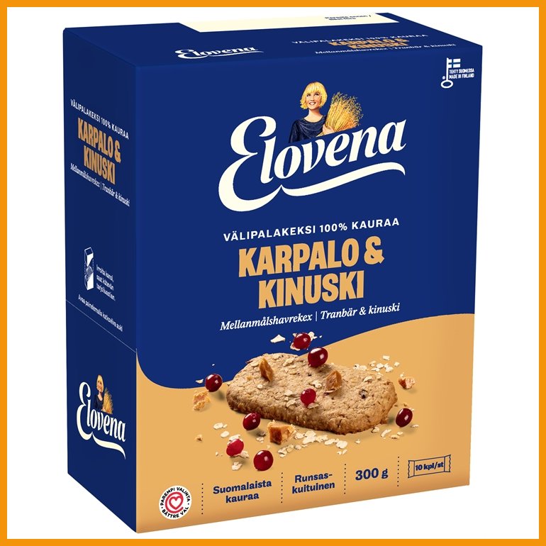 Elovenan Karpalo & Kinuski -välipalakeksi on terveellisempi vaihtoehto herkkusuille. Runsaasti kuitua sisältävä 100 % kaurasta valmistettu keksi on yksittäispakattuna näppärä napata mukaan päivän rientoihin antamaan paljon kaivattua lisäpotkua. Tuotteelle on myönnetty Suomen Sydänliiton Sydänmerkki.Pakkauksessa on 10 keksiä.