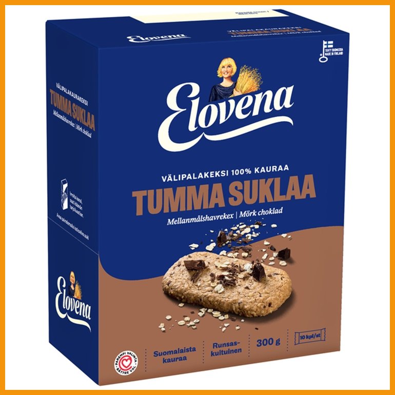 Elovena Tumma Suklaa Välipalakeksi on terveellisempi vaihtoehto herkkusuille. Runsaasti kuitua sisältävä 100 % kaurasta valmistettu keksi on yksittäispakattuna näppärä napata mukaan päivän rientoihin antamaan paljon kaivattua lisäpotkua. Tuotteelle on myönnetty Suomen Sydänliiton Sydänmerkki.Pakkauksessa on 10 keksiä.