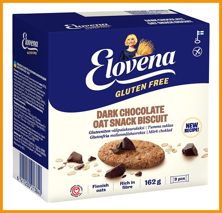 Elovenan Tumma Suklaa -välipalakeksi on gluteeniton vaihtoehto herkkusuille. Runsaasti kuitua sisältävä, 100 % suomalaisesta täysjyväkaurasta valmistettu keksi on yksittäispakattuna näppärä napata mukaan päivän rientoihin antamaan paljon kaivattua lisäpotkua. Tuotteelle on myönnetty Suomen Sydänliiton Sydänmerkki ja Avainlippu.Pakkauksessa on 9 keksiä.