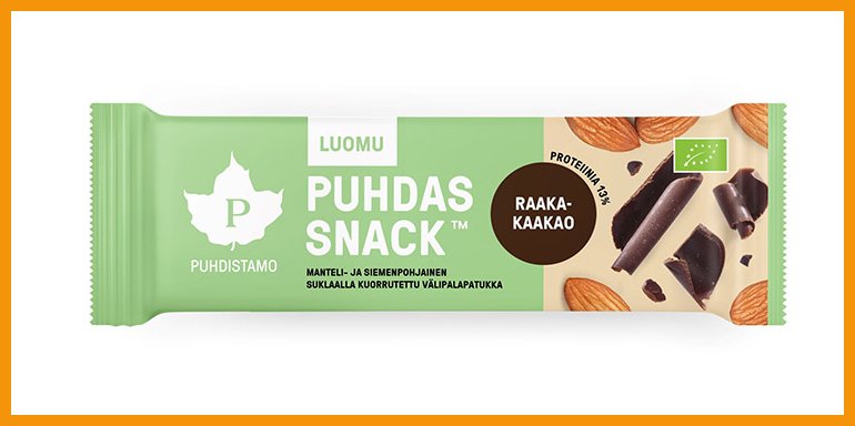 Puhdistamon Puhdas Snack on täysin lisäaineeton ja luomu välipalapatukka. Maun patukkaan antaa raakakaakao. Kaakaon lisäksi manteleista, taatelista ja siemenistä valmistetun patukan luonnollinen maku on viimeistelty ripauksella hunajaa ja merisuolaa sekä kevyellä suklaakuorrutuksella. Patukassa on jopa 13 grammaa proteiinia, joten se sopii hyvin myös treenievääksi!Paino: 40 g.