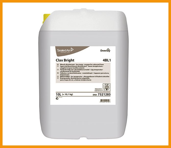 Clax Bright 4BL1 on erityisesti ammattimaiseen tekstiilienpesuun kehitetty desinfiointi- ja valkaisuaine, jota voidaan käyttää kaikkien muiden tekstiilien valkaisuun paitsi villan. Tuotteen avulla valkaisu ja desinfiointi onnistuvat matalissakin lämpötiloissa, jolloin energiaa säästyy ja tekstiilien käyttöikä pitenee. Hyvin stabiloidun ja tehokkaan valkaisuaineen teho perustuu peroksihapon johdannaiseen. Helposti pumpattavan nesteen oikea annostelu on vaivatonta.Pakkauskoko: 10 litraa