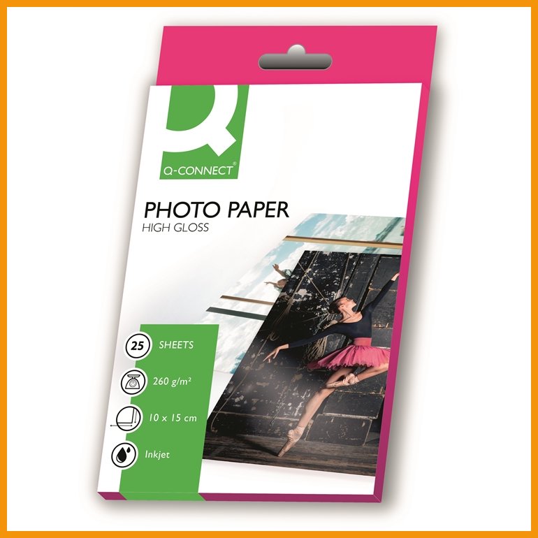 Q-CONNECT Photo Paper High Gloss on erittäin kiiltäväpintainen, yksipuolinen valokuvapaperi mustesuihkutulostukseen. Laadukas ja vahva paperi takaa ammattimaiset tulosteet digitaalisista valokuvistasi.Koko: 10 x 15 cm