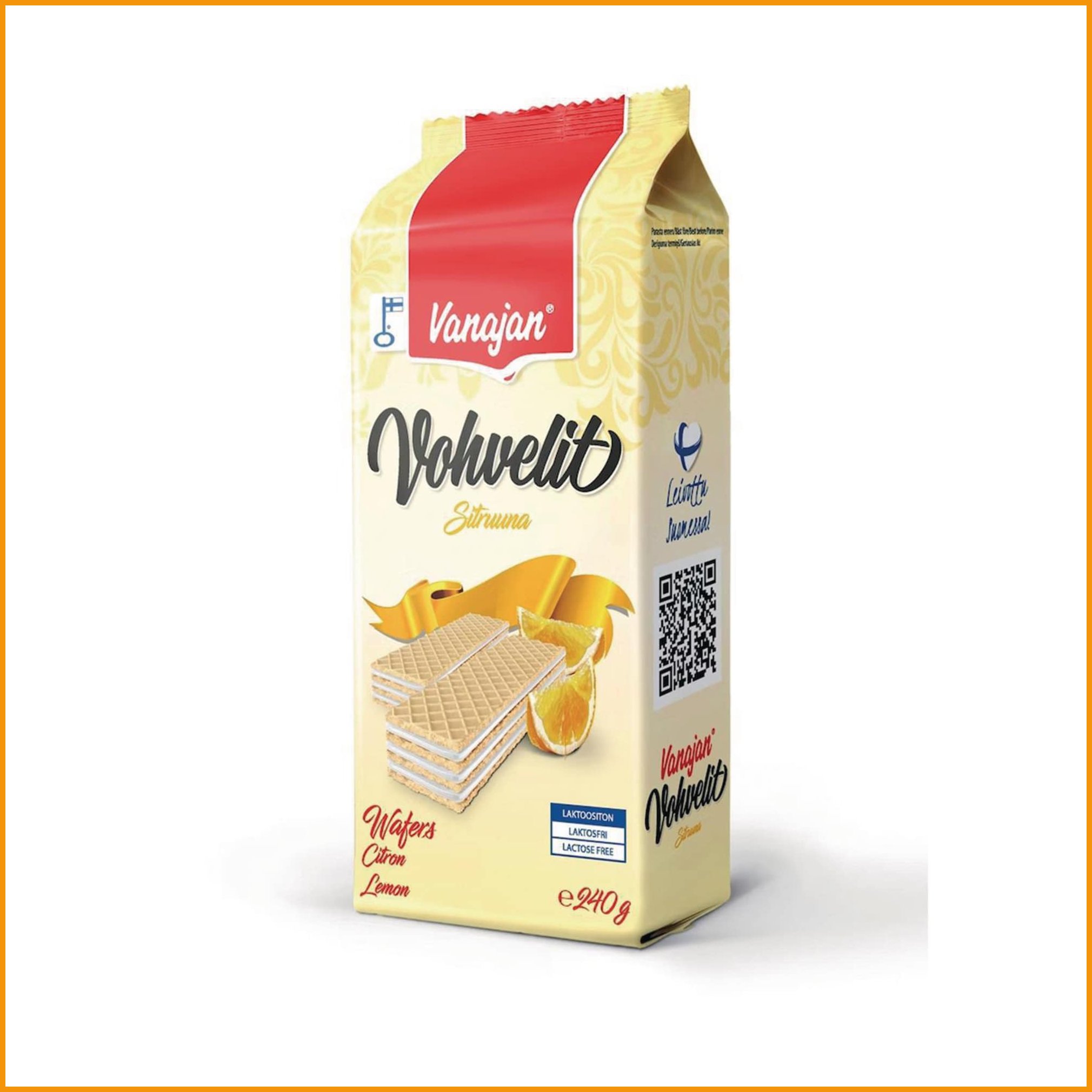 Vanajan® Sitruunavohvelit ovat suosittuja niin toimiston kahvitauolle kuin kotiin välipalaksi. Sujauta muutama vohveli mukaan tai nappaa koko pakkaus. Maistuvat laktoosittomat vohvelit ovat ihanan rapeita ja pitävät sisällään seitsemän (7) vohvelikerrosta, yhdessä raikkaan ja pehmeän sitruunatäytteen kera. Kotimaiset Vanajan® vohvelikeksit valmistetaan Hämeenlinnassa. 7 rapeaa kerrosta Sitruunatäyte Laktoositon Kotimainen Avainlippu-tuote Ainekset: Vehnäjauho, kokonaan kovetettu kookosöljy, sokeri, glukoosi, vehnätärkkelys, vehnäkuitu, rypsiöljy, luontainen sitruuna-aromi, emulgointiaine (rypsilesitiini), nostatusaineet (E500, E503), happamuudensäätöaine (sitruunahappo), aromit, suola. Saattaa sisältää pieniä määriä hasselpähkinää ja mantelia. Valmistusmaa: Suomi.