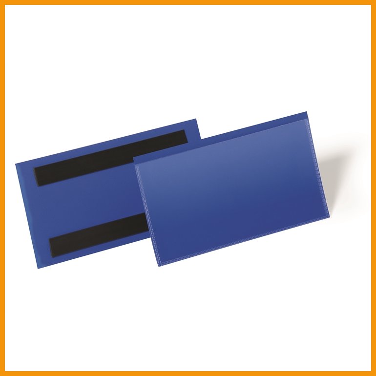 Durablen varastotasku kiinnittyy varastohyllyjen reunoihin kahdella magneettiliuskalla. Taskun läpi voi skannata vaivattomasti.Löydät muita kokoja verkkokaupastamme koodeilla 204402 (100 x 38 mm) ja 204404 (A4).