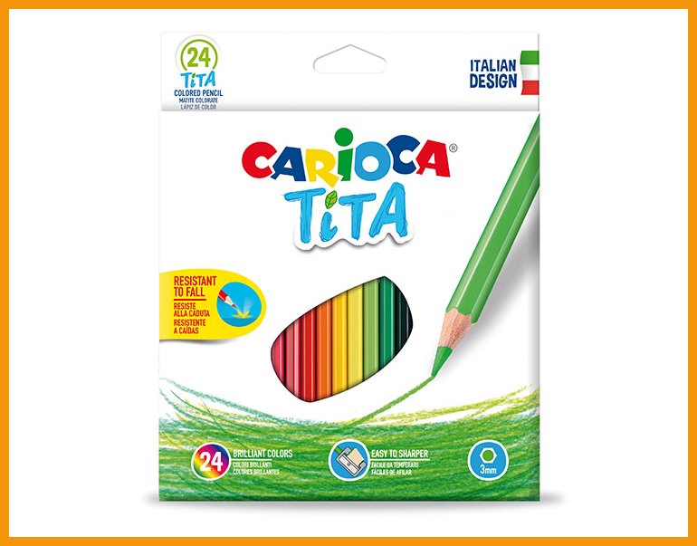 Puuvapaan CARIOCA Tita -värikynän kuusikulmainen runko on valmistettu synteettisestä hartsimateriaalista, joka kestää erinomaisesti putoamista ja pureskelua. Pehmeällä lyijyllä saa aikaan voimakkaat värit, ja kynä on helppo teroittaa.Lyijyn paksuus: 3 mm