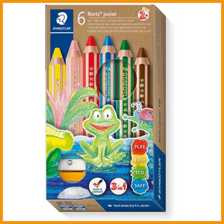 Staedtler Noris Junior 3 in 1 on monikäyttöinen värikynä, joka toimii myös vahaliituna ja akvarellikynänä. Lasten käteen sopivassa kynässä on paksu kuusikulmainen runko ja pehmeä lyijy, joka tuottaa kirkkaat värit niin paperille, kartongille, lasille kuin monille muillekin alustoille. Erittäin paksu lyijy kestää hyvin murtumista.Dermatologisesti testattu tuote on valmistettu PEFC-sertifioidusta puusta.