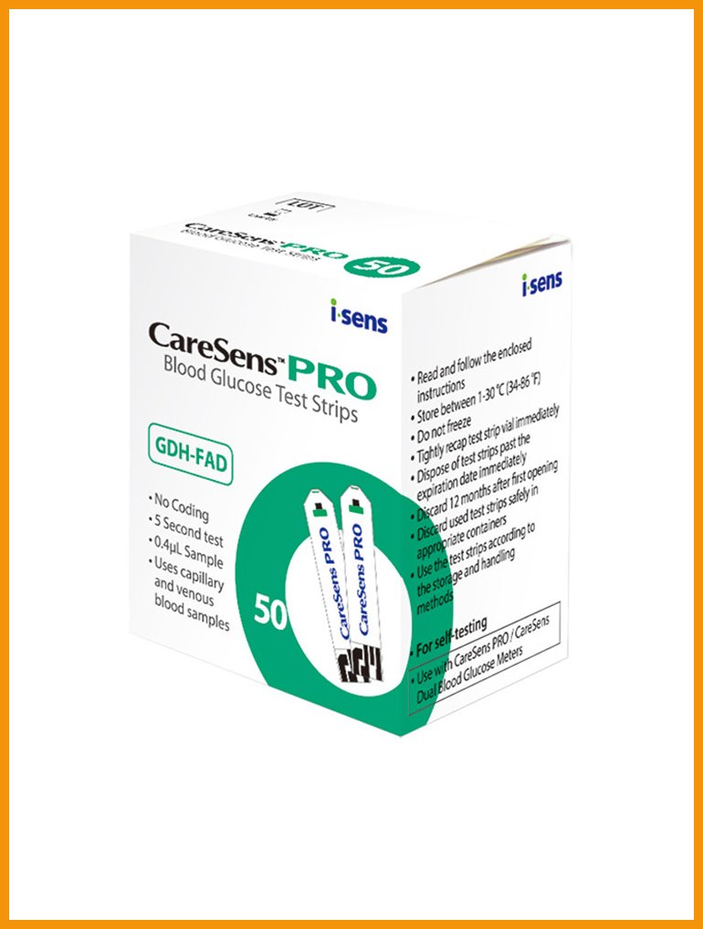 CareSens Pro -verensokeritestiliuskat soveltuvat CareSens Dual- ja CareSens PRO -verensokerimittareille, kapillaari- ja laskimoverinäytteille sekä happihoitoisten potilaiden verensokerin määrittämiseen (GDH-menetelmä). Liuskat vaativat erittäin pienen näytemäärän (vain 0,4 mikrolitraa) ja mittaus tapahtuu jo viidessä sekunnissa. Testiliuskaa ei tarvitse koodata erikseen. CE 0123 -merkitty lääkinnällinen laite täyttää standardin ISO 15197:2013 vaatimukset.Valmistaja: i-SENS, Inc