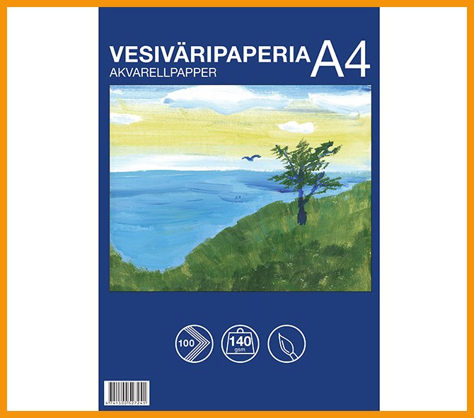 Vesiväripaperi on blankoa ja erittäin vahvaa valkoista paperia, joka kestää hyvin vesiväreillä maalaamisen tuottaman kosteuden.Mitat: A4