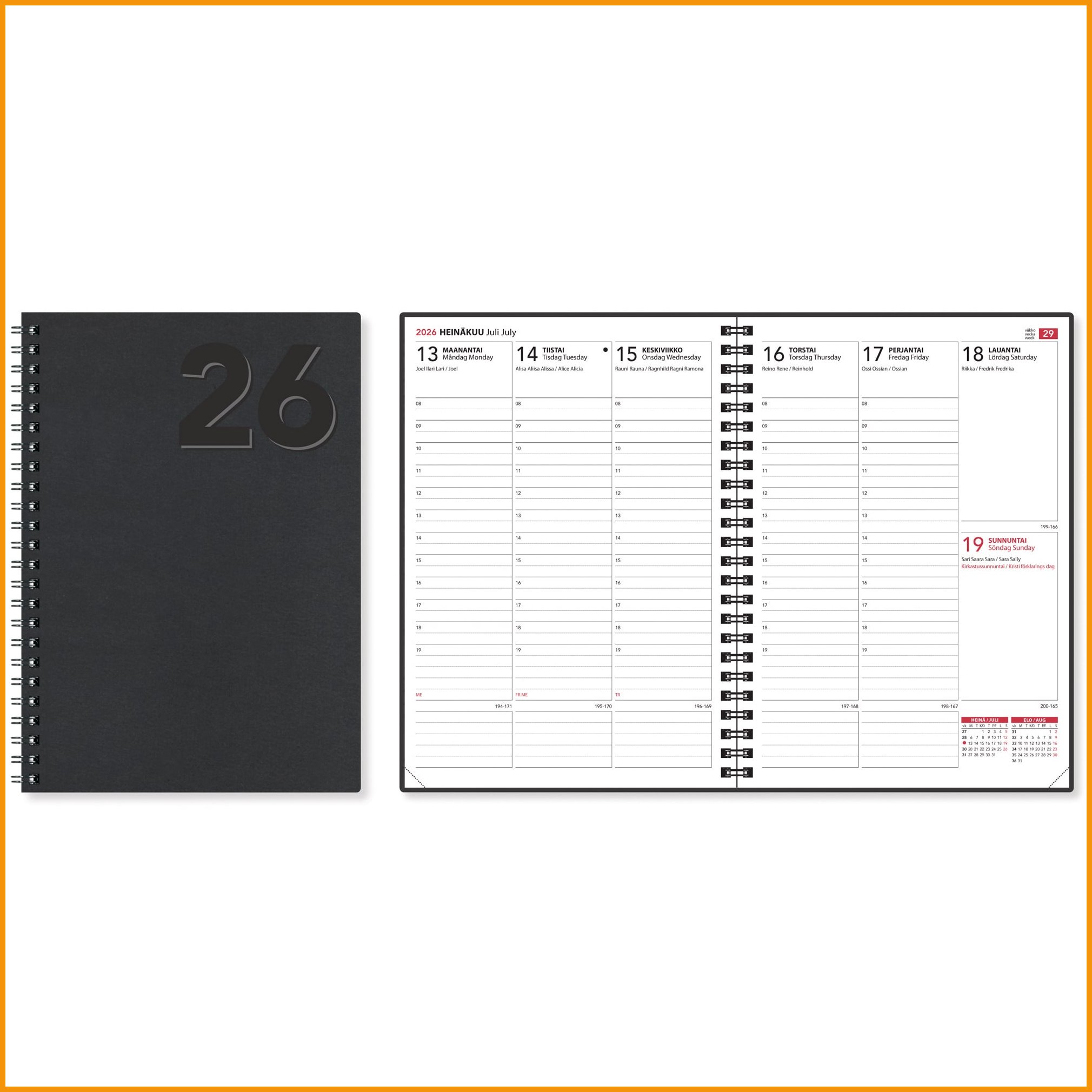 CC 2366 Viikkomuistio 2026 CC 2366 Viikkomuistio 2026 on klassinen ja monipuolinen A5-kokoinen viikkokalenteri, joka tekee ajanhallinnasta selkeää ja tehokasta. Tämä vuoden 2026 kalenteri tarjoaa kattavan viikko-aukeaman, jossa jokainen päivä näkyy tunneittain klo 8–19. Näin jokaiselle merkinnälle jää riittävästi tilaa, olipa kyseessä kokous, projekti tai henkilökohtainen muistutus. Kalenteri kattaa viikot 49/2025–1/2027, joten se toimii luotettavana apuna koko vuoden ja myös seuraavan alkuun. Mukana ovat vuosisuunnitelmat 2026 ja 2027, pitkän aikavälin vuosikalenterit 2027–2030 sekä runsaasti lisäsisältöä, kuten yleiskalendaario, nimipäivät, liputuspäivät ja kansalliset pyhät. Lisäksi kalenterissa on infosivuja, tehtäväluetteloita sekä kahden kuukauden seurantajaksot jokaisella aukeamalla, mikä helpottaa pitkän aikavälin suunnittelua. Kierresidonta ja kulmaperforointi tekevät käytöstä helppoa ja kestävää. Runsas muistiinpanotila varmistaa, että niin arjen asiat kuin työprojektit pysyvät hallinnassa. Kolmikielisyys (suomi, ruotsi ja englanti) tekee kalenterista monikäyttöisen sekä kotimaisissa että kansainvälisissä ympäristöissä. Tilaa CC 2366 Viikkomuistio 2026 kalenteri netistä ja varmista, että aikataulusi pysyvät järjestyksessä vuoden jokaisena päivänä. Tämä viikkokalenteri verkkokaupasta sopii niin toimistolle, opiskeluun kuin henkilökohtaiseen käyttöön. Kalentereilla ei ole vaihto- eikä palautusoikeutta.Viikkomuistio 2026 Cc 2366 eko viikkokalenteri musta 148 × 210mm on korkealaatuinen kalenteritarvike, jonka verkkokauppatilauksen toimitus perille kestää 1-2 päivää. Muistathan, että toimitus on ilmainen yli 140 € hintaisille verkkokauppa ostoksille! Meiltä voit tilata laskulla ja ilman rekisteröitymistä.