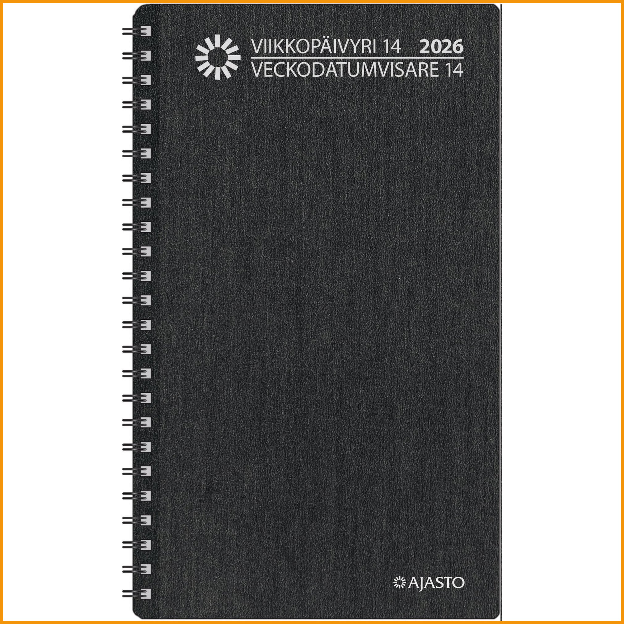Viikkopäivyri 2026 Ajasto 14 pöytäkalenteri tummanharmaa 120 x 210mm hinta 11,85€