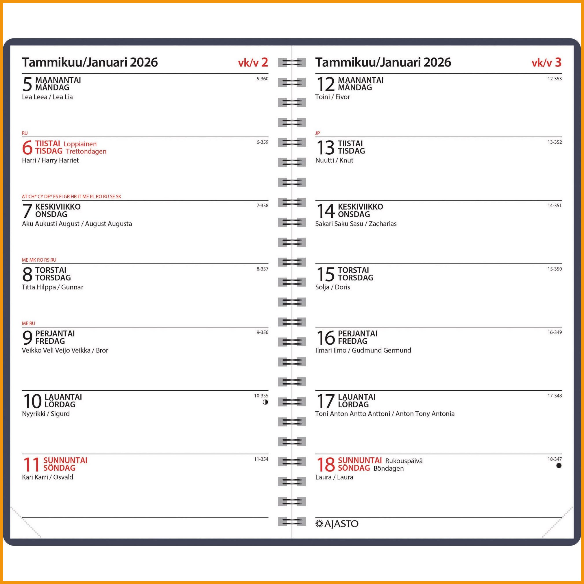 Hinta 4,27€ / kplAjasto Euro Memo 2026 -pöytäkalenteri sisältää kieliversiot suomi, ruotsi, englanti, saksa ja ranska. Monikielisyyden ansiosta Euro Memo 2023 sopii esimerkiksi monikansalliseen yritykseen, jossa tarpeen pitää säännöllistä yhteyttä ulkomaille. Ajasto ...
