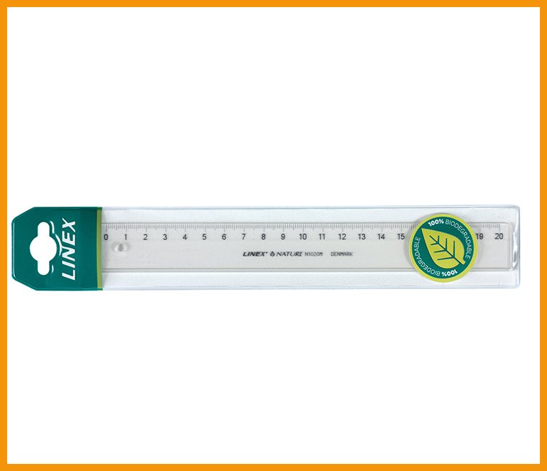 Linex Nature N1030 on läpinäkyvä, maissitärkkelyksestä valmistettu viivoitin. Tuotteet on pakattu kierrätyspahvista valmistettuun pakkaukseen, jonka painomuste on kasvipohjaista.Pituus: 20 cm