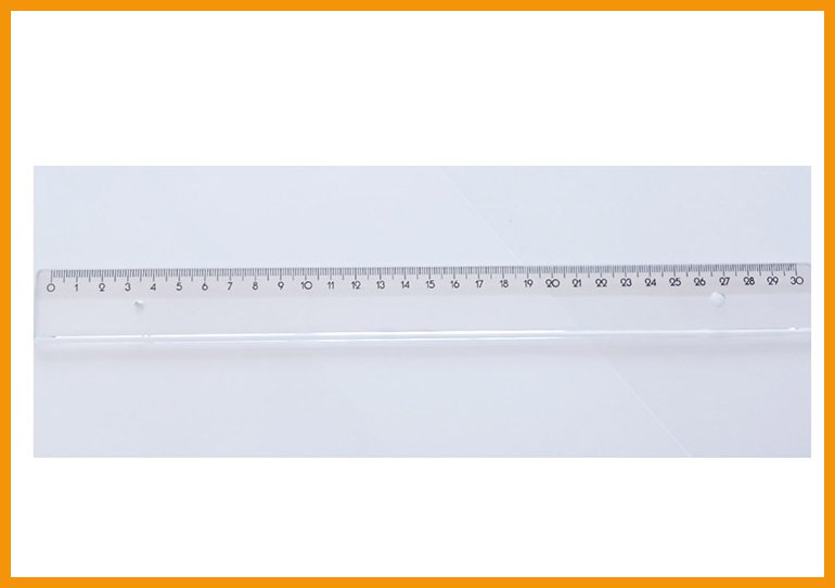 Läpinäkyvästä muovista valmistettu viivoitin tussireunalla. Metrinen asteikko millimetrin tarkkuudella.Pituus: 30 cm.