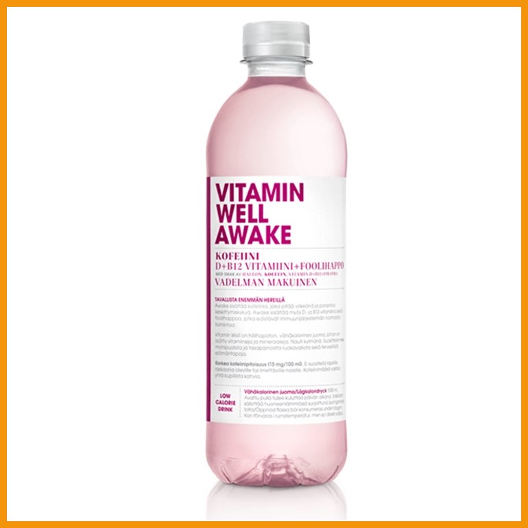 Vitamin Well Awake on hiilihapoton ja runsaasti vitaminoitu, vadelmalta maistuva juoma. Juoman sisältämät vitamiinit edistävät mm. immuunijärjestelmän normaalia toimintaa. Foolihappo ja kofeiini auttavat puolestaan vähentämään väsymystä ja uupumusta, mikä tekee tuotteesta hyvän korvikkeen energiajuomille.Sisältö: 0,5 litraa