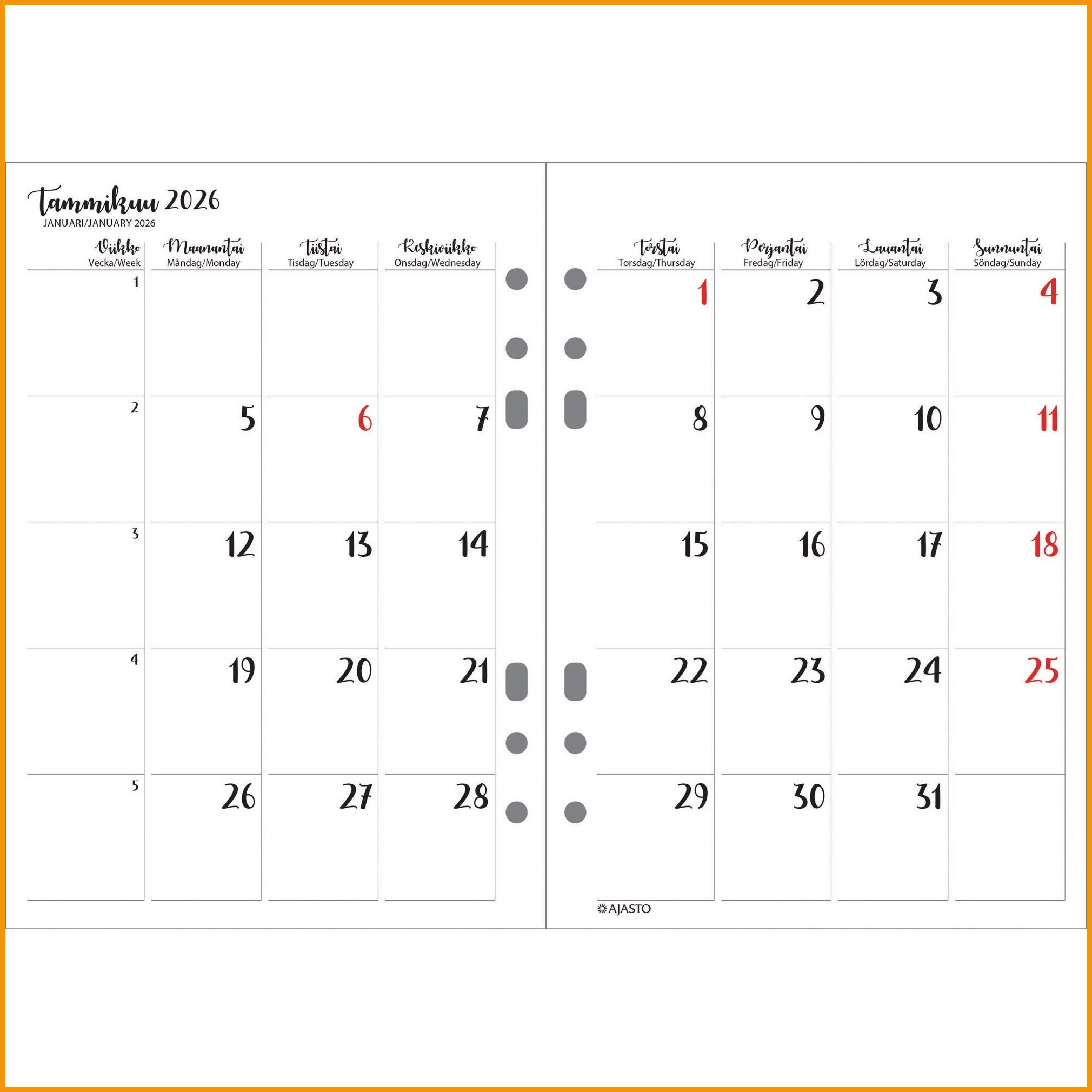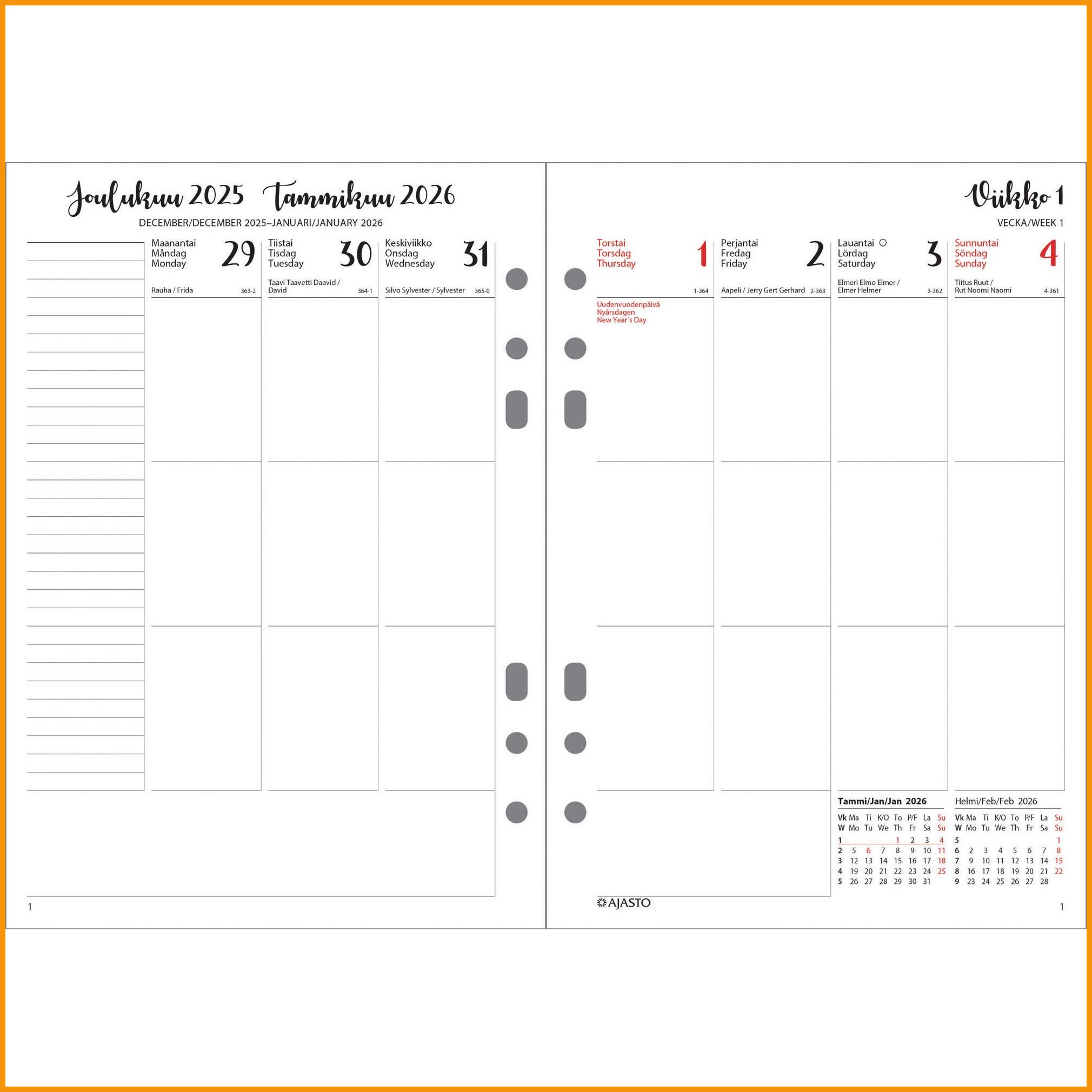 Hinta 16,45€ / kplJokapäivä-vuosipaketti 2026 päivittää vanhan taskukalenterisi taas seuraavalle vuodelle. Vuosipaketti sopii kalentereiden Agenda, Jokapäivä, Korona ja Plano 85 x 162 mm -kokoisiin kansiin. Jokapäivä-vuosipaketti näyttää aukeamalla täyden viikon, viikkonumeron ja kuukausiseurannan.
