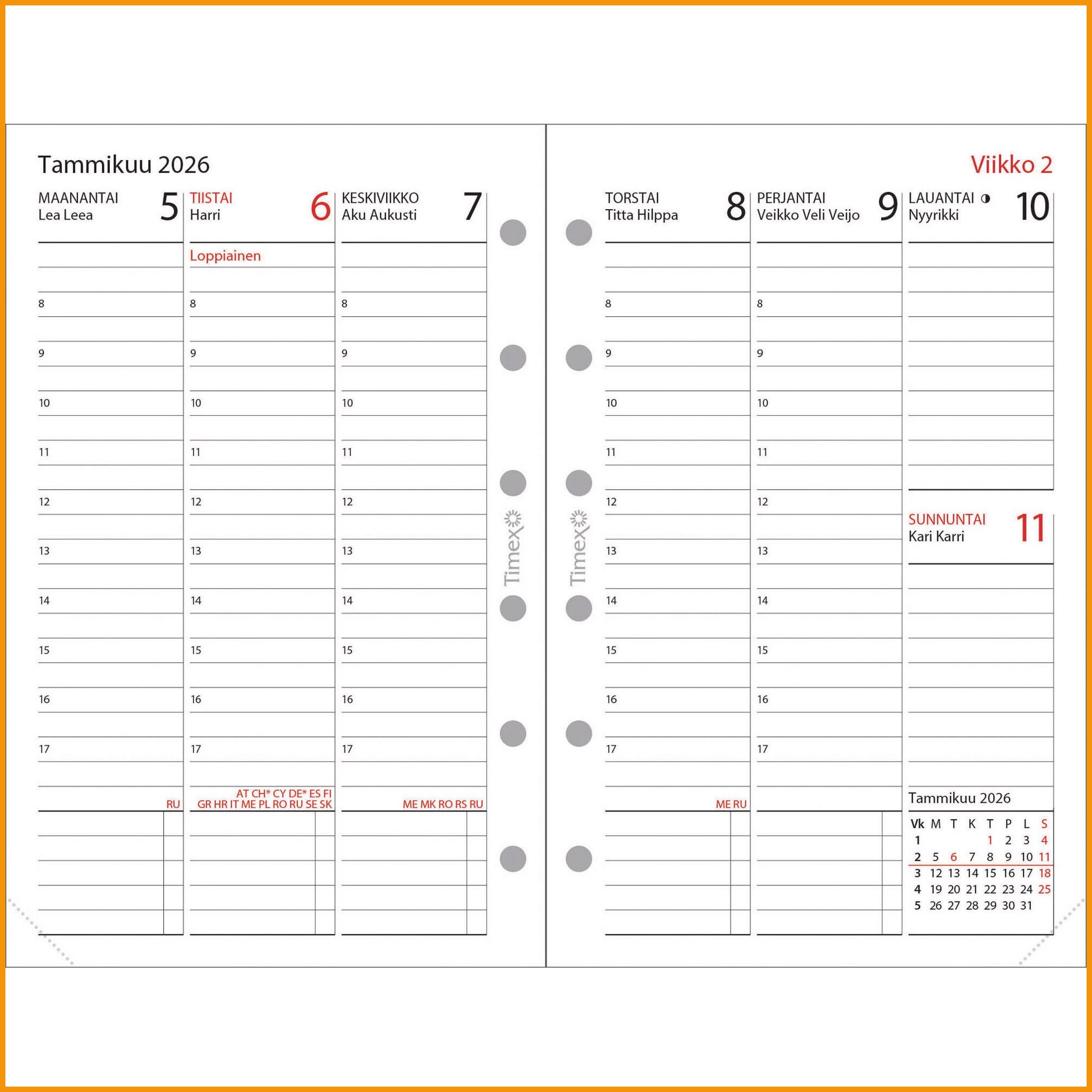Hinta 16,45€ / kplJokapäivä-vuosipaketti 2026 päivittää vanhan taskukalenterisi taas seuraavalle vuodelle. Vuosipaketti sopii kalentereiden Agenda, Jokapäivä, Korona ja Plano 85 x 162 mm -kokoisiin kansiin. Jokapäivä-vuosipaketti näyttää aukeamalla täyden viikon, viikkonumeron ja kuukausiseurannan.