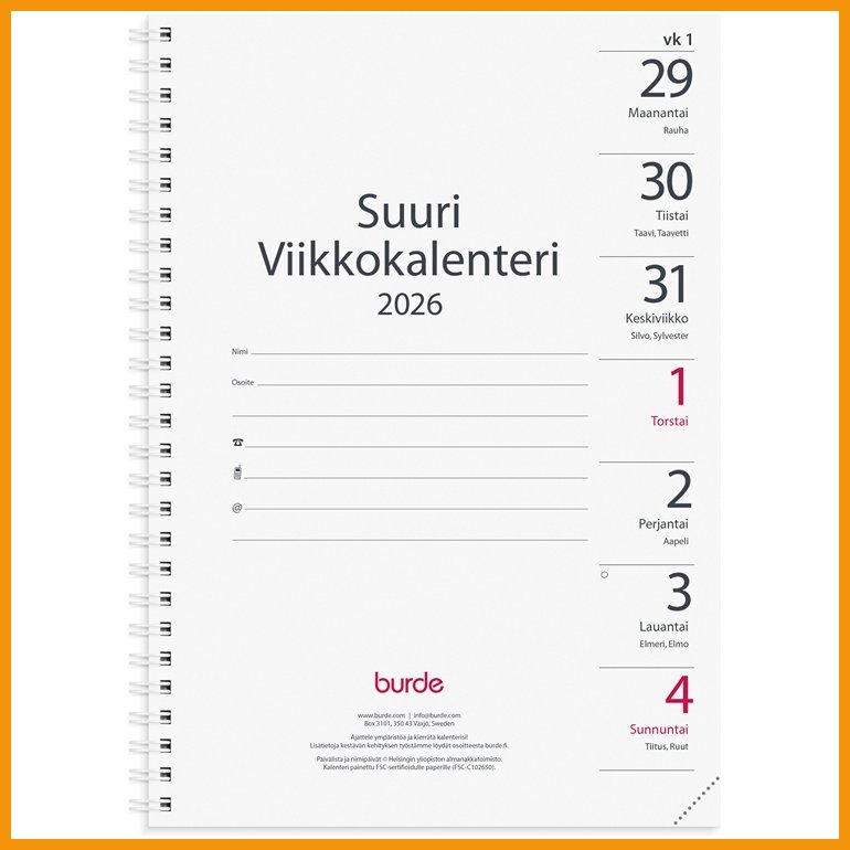 Vuosipaketti 2026 Kalenteri Suuri viikko on tasokas kalenteritarvike, jonka verkkokaupan tilauksen toimitus kestää 1-2 päivää. Muistathan, että hinnaltaan yli 140 € verkkokauppatilaus toimitetaan aina ilmaiseksi! Meiltä voit tilata laskulla ja ilman rekisteröitymistä.