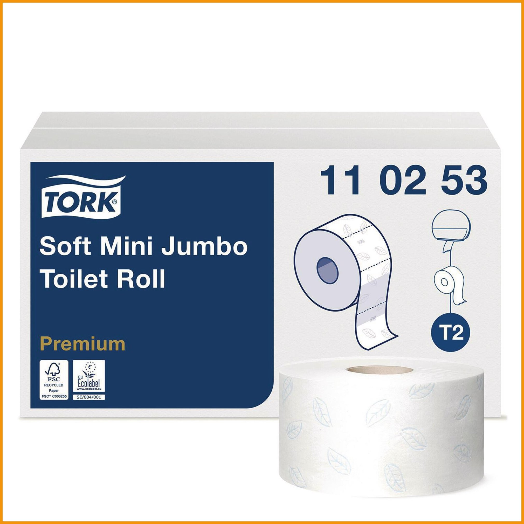 WC Paperi Tork Premium Mini Jumbo Valkoinen 12 kpl. Tork Mini Jumbo rulla tarjoaa paljon enemmän wc-paperia kuin perinteiset rullat, tehostaen näin ajankäyttöä ja vähentäen kustannuksia. 2-kerroksinen Tork Mini Jumbo -wc-paperi näyttää ja tuntuu upealta.