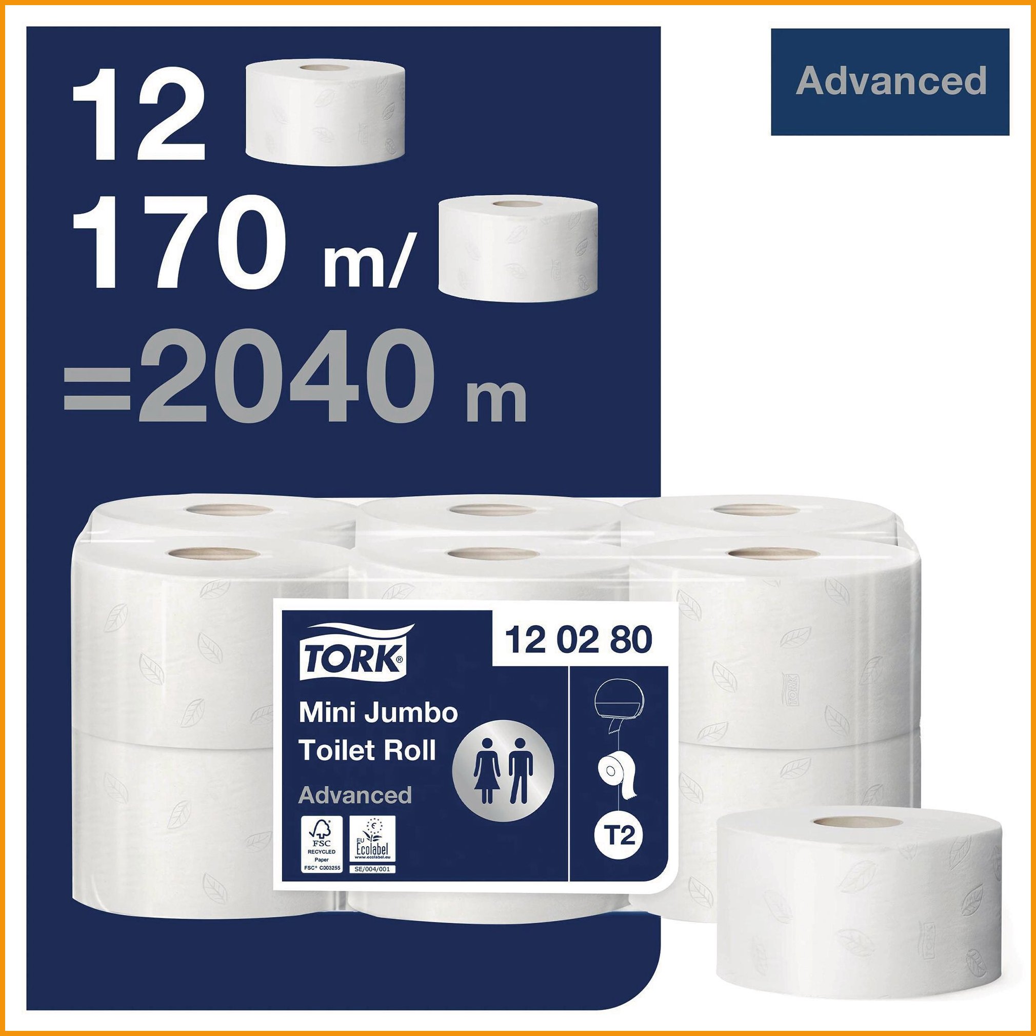 Paperi Tork Advanced Mini Jumbo on valkoinen harmaalla lehtikuviolla oleva T2-annostelijaan yhteensopiva WC-paperirulla. WC-paperit toimitetaan 12 rullan säkissä pikatoimituksena.