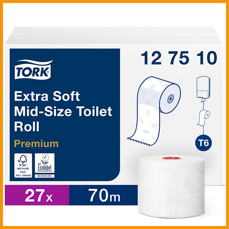 Tork Extra Soft Mid-size on Tork T6 -annostelijaan sopiva Premium-laatuinen ja riittoisa wc-paperi. miellyttävästi kohokuvioitu ja erittäin pehmeä paperi soveltuu laatutietoisille käyttäjille sekä vähäisten että kohtalaisten käyttäjämäärien wc-tiloihin.FSC-sertifioidusta kuidusta valmistetulla paperilla on EU Ecolabel -ympäristösertifikaatti. Myös muovipakkaus on valmistettu vähintään 30-prosenttisesti kierrätysmateriaalista.