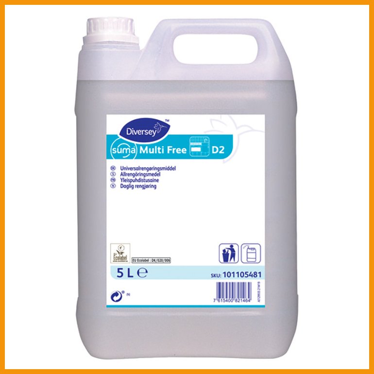 Diverseyn Suma Multi Free D2 on tehokas yleispuhdistusainetiiviste ruoanvalmistustilojen kovien pintojen puhdistamiseen. Aine soveltuu myös astioiden liotukseen ja pesuun. Heikosti emäksinen ja kaikenkovuisissa vesissä toimiva tuote sisältää anionisia ja ionittomia pinta-aktiivisia aineita, jotka irrottavat tehokkaasti rasvaa ja kiinni kuivunutta likaa.Tuotteella on pohjoismainen Joutsenmerkki.