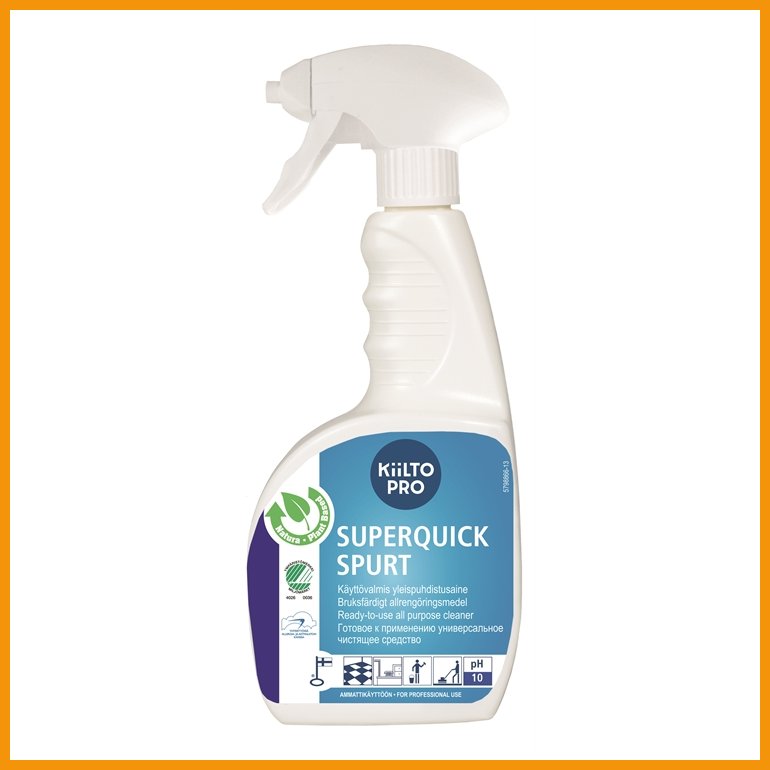 Kiilto Pro Superquick Spurt on käyttövalmis yleispuhdistusaine, joka puhdistaa tehokkaasti kaikki kovat ja vedenkestävät pinnat eikä vaadi huuhtelua. Tuote poistaa tehokkaasti sormenjäljet, lian ja muut tahrat ja sillä on hyvä puhdistuskyky mm. erilaisille tasopinnoilla, teräksellä ja pleksilasilla.Kotimaisella ja hellävaraisella Kiilto Pro Natura -sarjan tuotteella on Avainlippu, pohjoismainen Joutsenmerkki ja Allergia-, Iho- ja Astmaliiton tunnus.