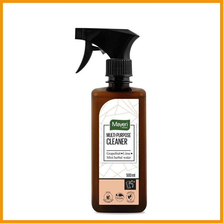Mayeri Organic Grapefruit & Lime on yleispuhdistusaine, joka poistaa tehokkaasti lian, rasvan ja epämiellyttävät hajut. Kaikille vettä sietäville pinnoille soveltuvassa suihkeessa on miellyttävä greipin ja limen tuoksu.Tuote on valmistettu minttu-yrittiveteen 95-prosenttisesti luonnon omista ainesosista uusiutuvalla energialla. Vegaanisella tuotteella on EU Ecolabel -ympäristösertifikaatti.