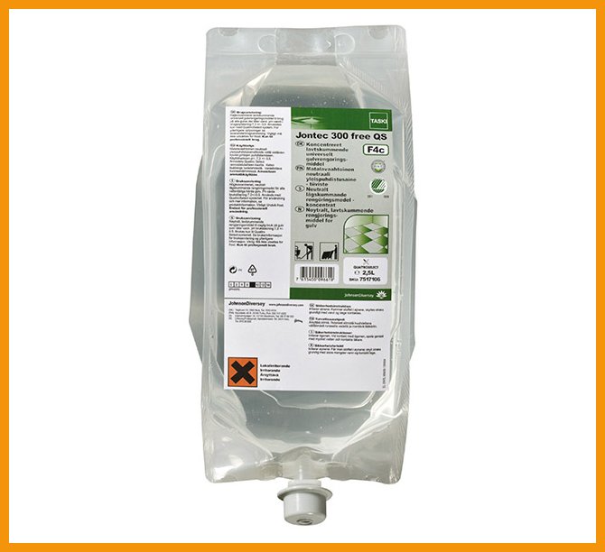 Taski Jontec 300 free QS F4c on hajusteeton ja väriaineeton yleispuhdistusainetiiviste QuattroSelect-annostelulaitteeseen. Matalavaahtoinen ja heikosti emäksinen tuote soveltuu vettä sietävien kovien pintojen puhdistamiseen sekä käsi- että konemenetelmin.Tuotteella on EU Ecolabel -ympäristösertifikaatti.