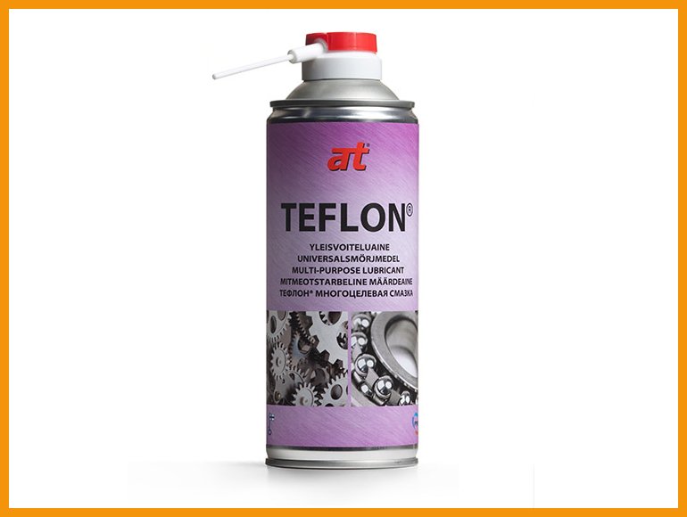 AT Teflon on laajalle käyttölämpötila-alueelle soveltuva monipuolinen yleisvoiteluaine. Synteettinen öljyn ja teflonin yhdistelmä tunkeutuu tehokkaasti mikroskooppisenkin pieniin paikkoihin, jonne se muodostaa suojaavan ja kosteutta erinomaisesti hylkivän voitelukalvon. Liikkuvien osien kitkan aiheuttamaa kulumaa vähentävä aine voitelee tehokkaasti ja kestää hyvin painetta.Käyttökohteita: venttiilit, ohjaimet, liukupinnat, kopio- ja konttorikoneet, kuljettimet, rullaradat, lukot, ohjauskiskot, työkalut yms.