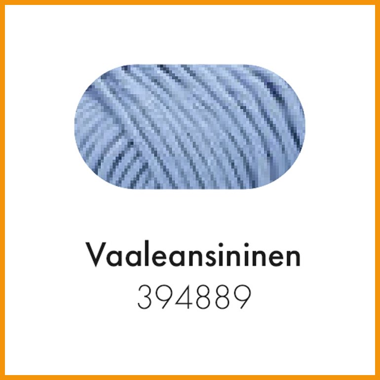 Pehmeä merseroimaton 100 % puuvillalanka, joka soveltuu virkkaukseen ja neulomiseen, etenkin erilaisiin kodin tuotteisiin: pannunaluset, patalaput, säilyttimet, kassit, pesulaput ja muut sisustustuotteet. Sopii hyvin myös aloittelijalle. Puikko- ja virkkuukoukkusuositus 4 mm. 50 g = noin 70 m. Öko-Tex-standardi 100 sertifikaatti.